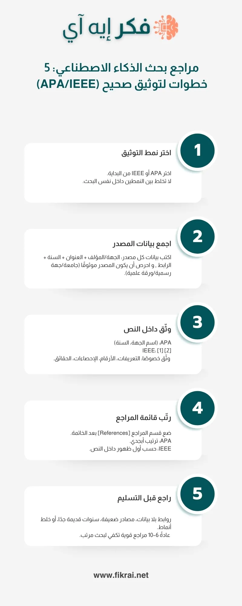 ملاحظة: التزم بنظام واحد فقط داخل البحث (APA أو IEEE)، ولا تخلط بينهما.