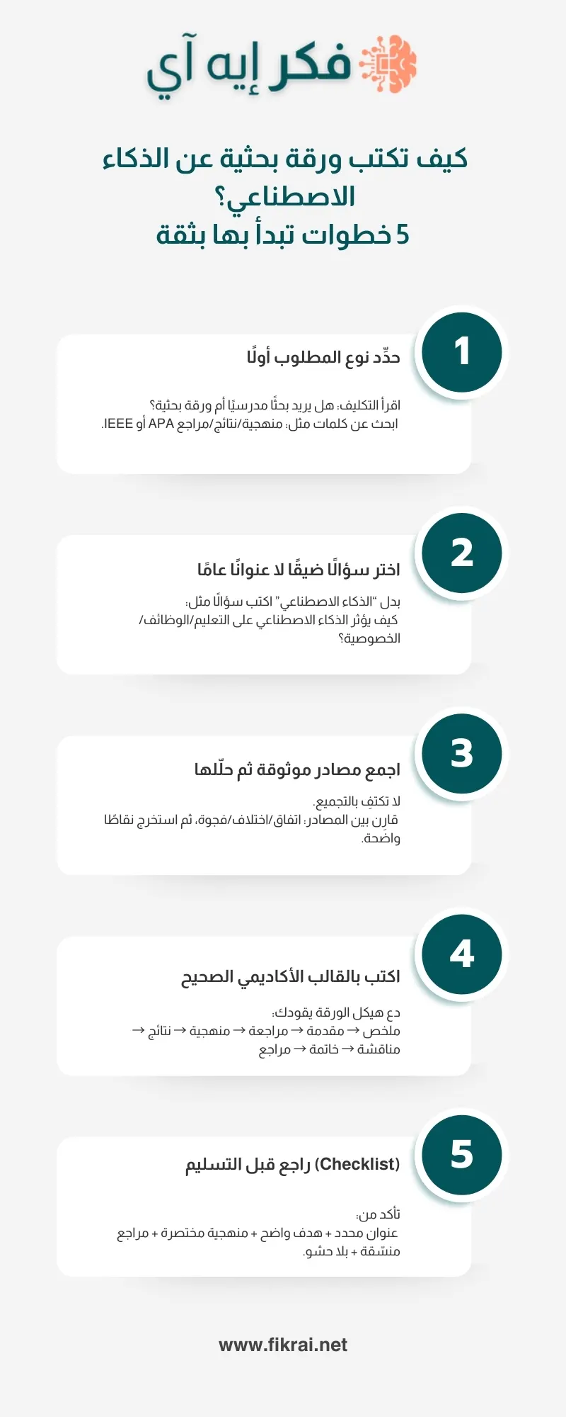 إنفوغرافيك يوضح 5 خطوات لبدء كتابة ورقة بحثية عن الذكاء الاصطناعي بثقة.